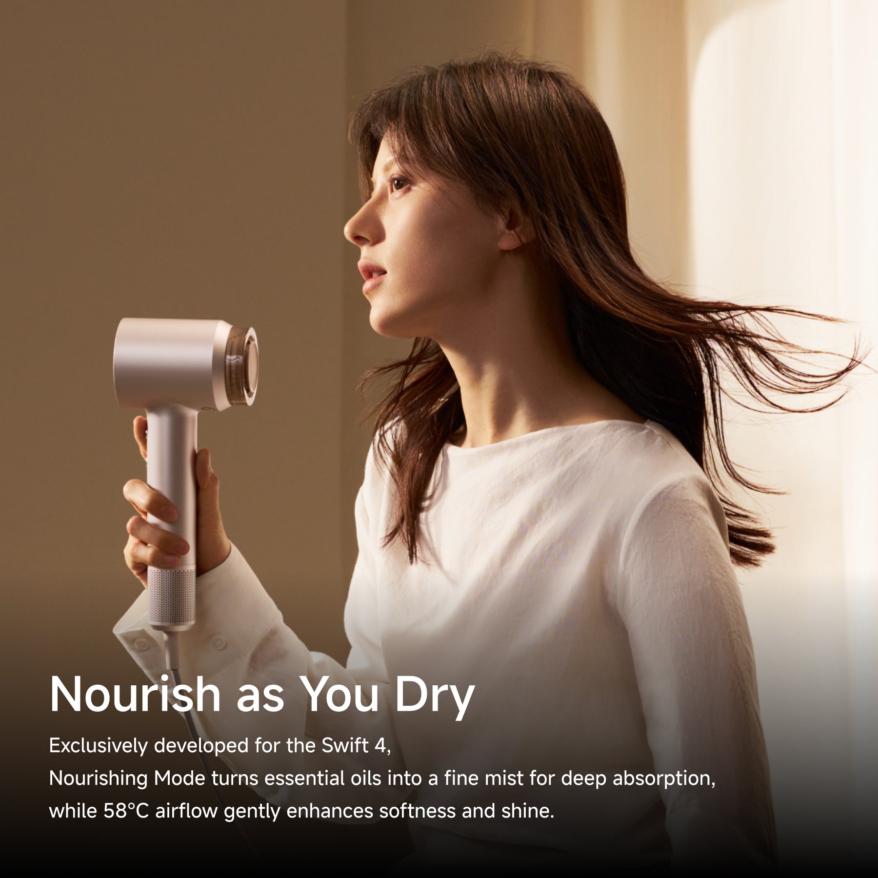 Enjoy a hair spa–like treatment at home with the Laifen Swift 4. Exclusively designed for the Swift 4, the Nourishing Mode transforms essential oils—added directly into the pod—into a fine mist for deeper absorption and enhanced hair care. Essential oils heat up to 58°C, releasing their nutrients for healthier-looking hair. It also delivers ultra-fast drying powered by a high-speed motor, providing a smooth and efficient styling experience. With advanced ion technology and multiple care modes, the Swift 4 helps ensure healthier-looking hair with every use.