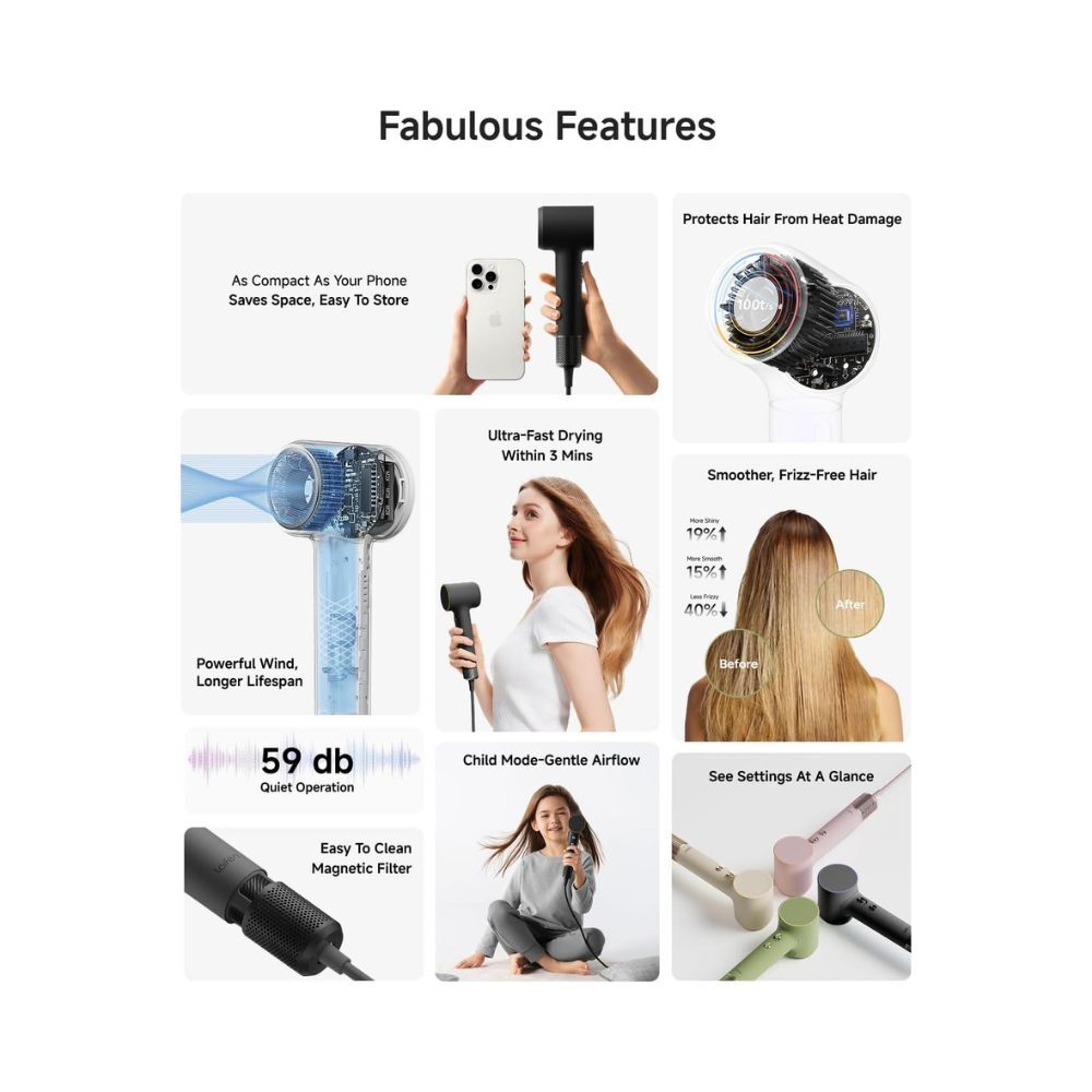The Laifen Mini has an ionic generator that emits negative ions that neutralize positive ions in water molecules in your hair, breaking them into smaller particles. This process speeds up drying, locks in moisture, and eliminates static electricity—taming frizz and flyaways for smooth, shiny hair